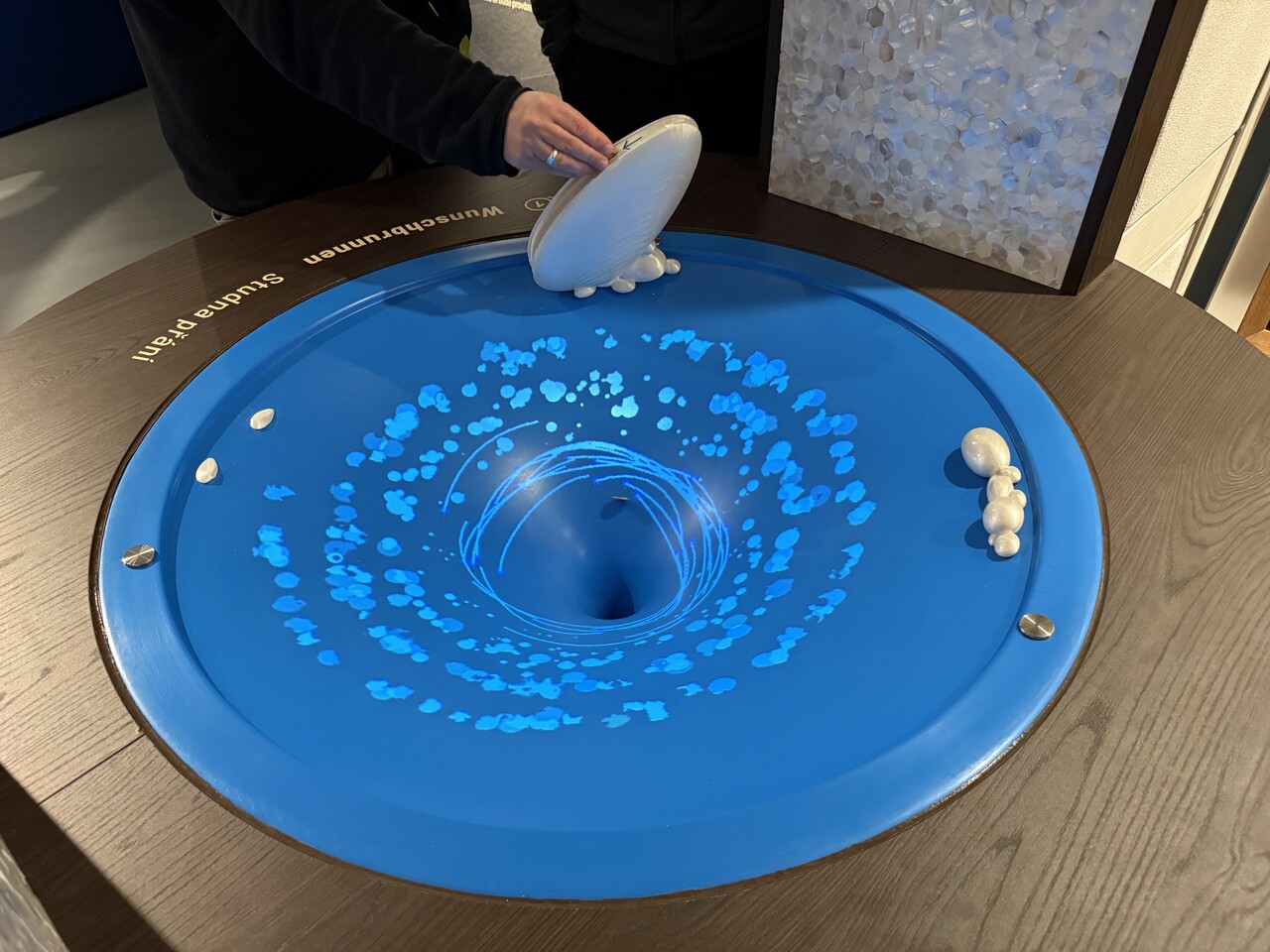 At the end of the exhibition, visitors encounter a donation well. In its design, it blends seamlessly into the exhibition as a staged fountain and at first glance appears to be an ordinary donation well. However, when a coin is inserted, it reveals a hidden media element. As soon as the coin drops, a generative animation begins, accompanying its path. When the coin disappears, the donation well offers a heartfelt thank-you to the generous visitor.