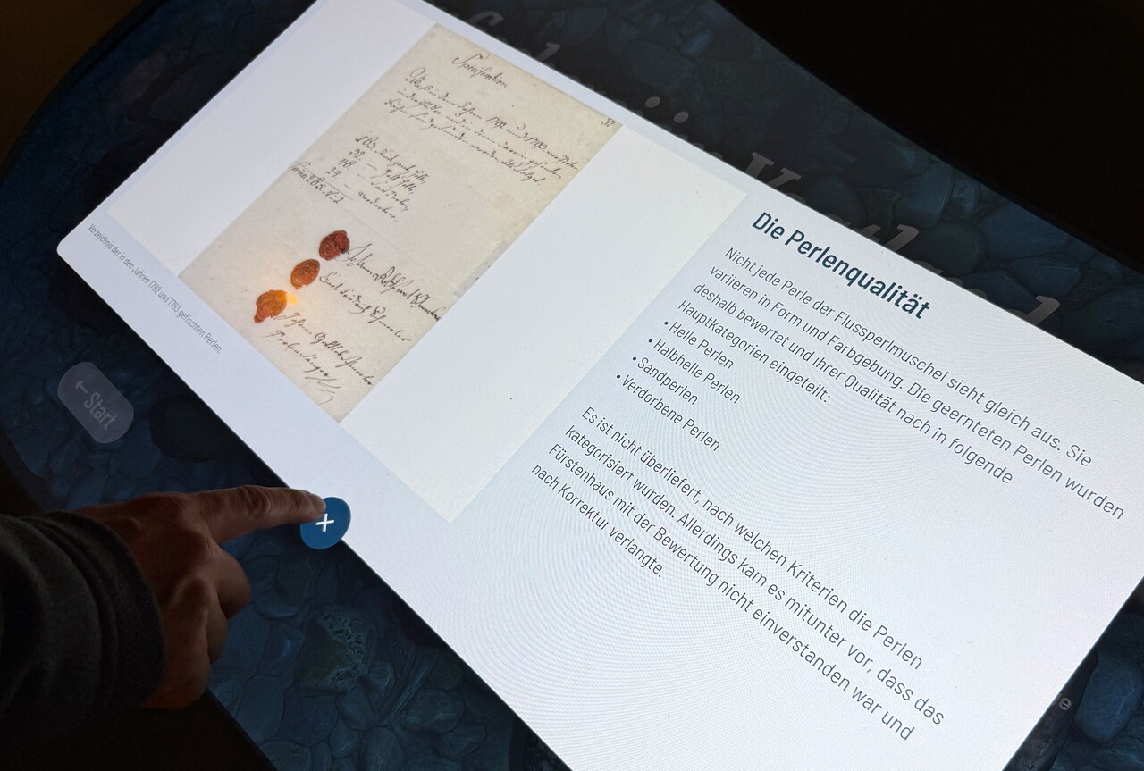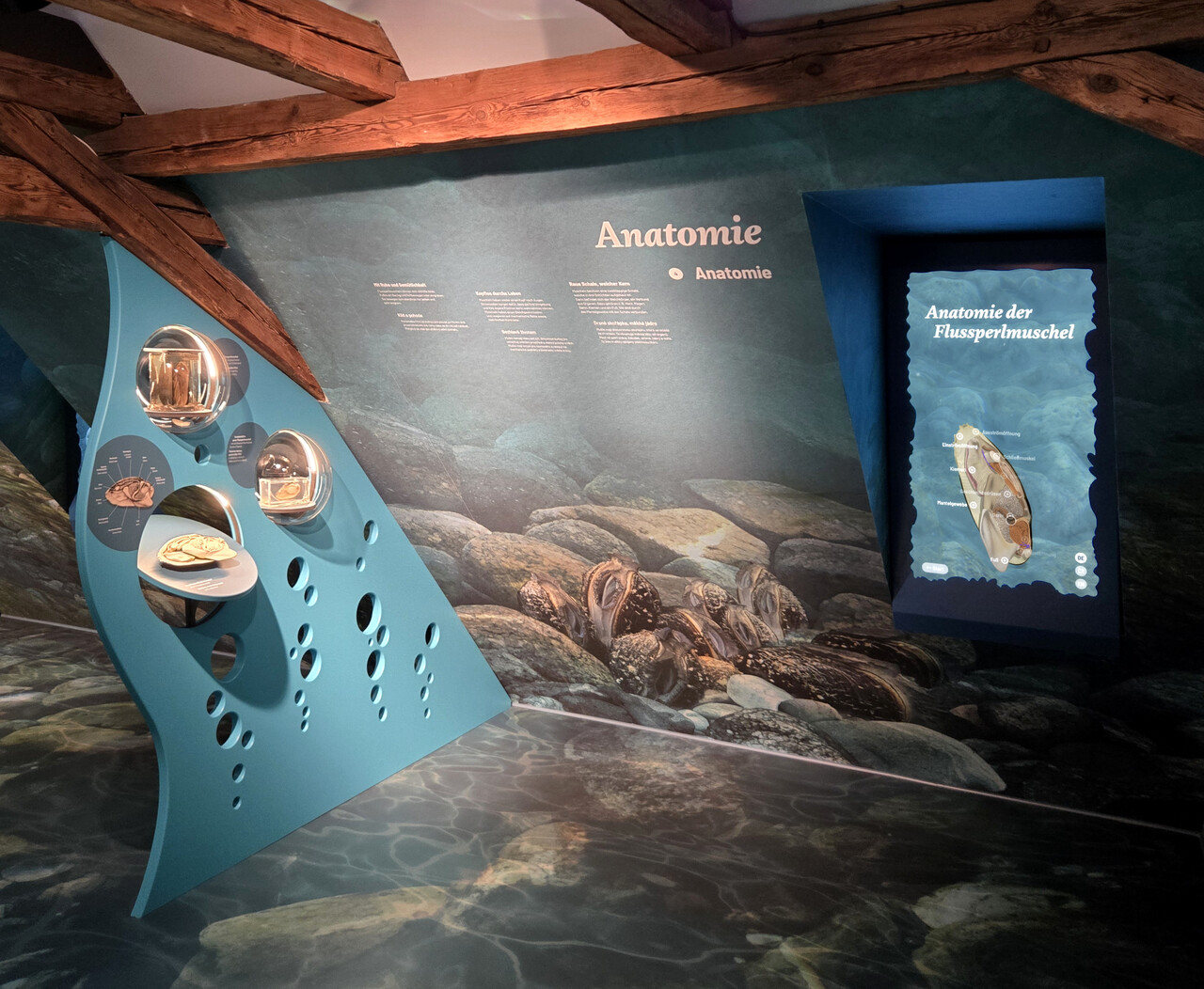 In den Fenstergauben des historischen Gebäudes befinden sich digitale Vertiefungsstationen. An diesen können die Besucher:innen Detailinformationen zur Anatomie und Ernährung der Flussperlmuschel abrufen, sowie verschiedene Fakten zu Perlenentstehung und -zucht erfahren.