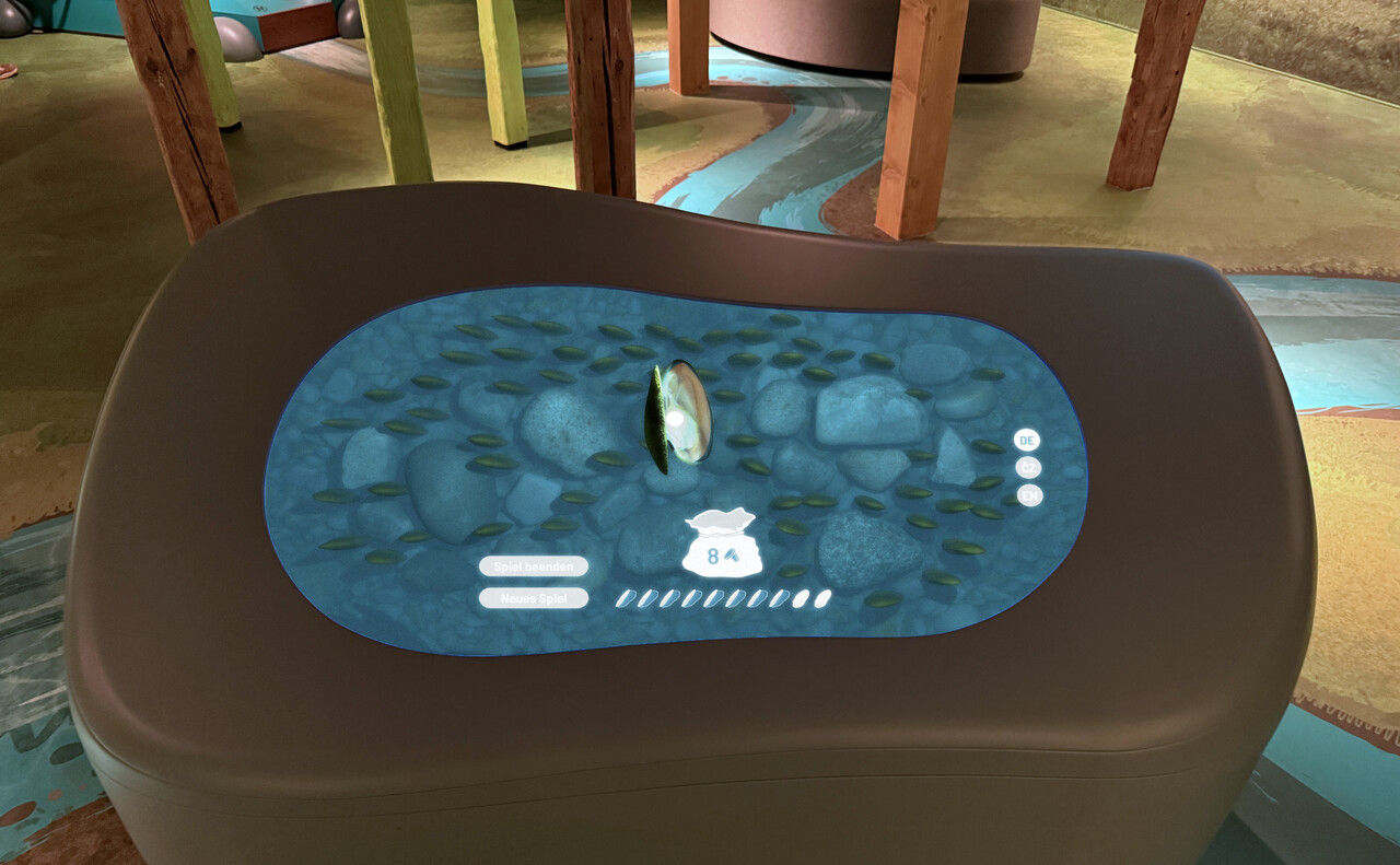 Auf einem virtuellen Flussbett liegen die Inhalte, und können von den Besucher:innen durch Berührung geöffnet werden.