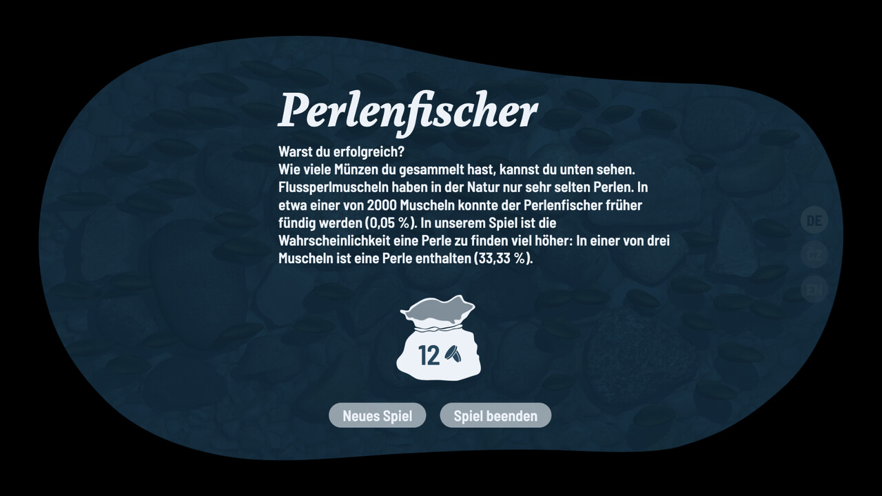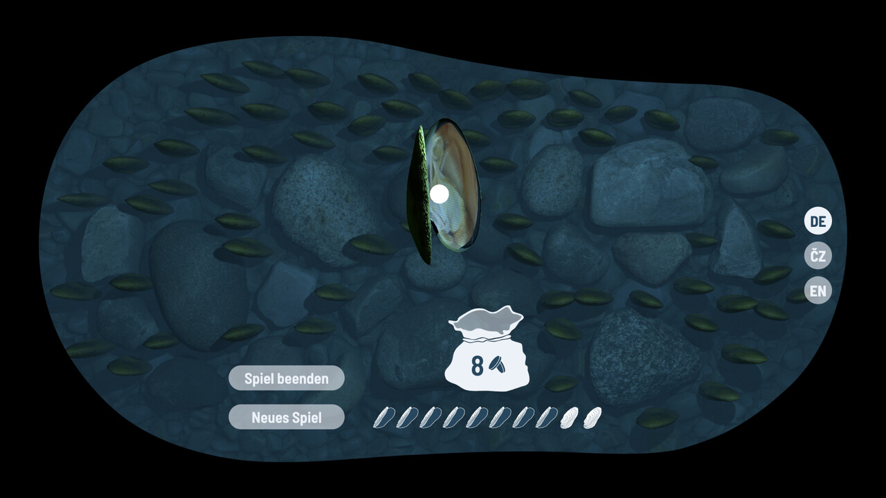 Auf dem Bildschirm wachsen digitale Flussperlmuscheln. Diese öffnen sich, sobald sie angeklickt werden. Mit etwas Glück befindet sich eine Perle im Inneren, die in das Sammelsäckchen wandert. Die Spieler:innen haben 10 Versuche, möglichst viele und große Perlen zu finden.