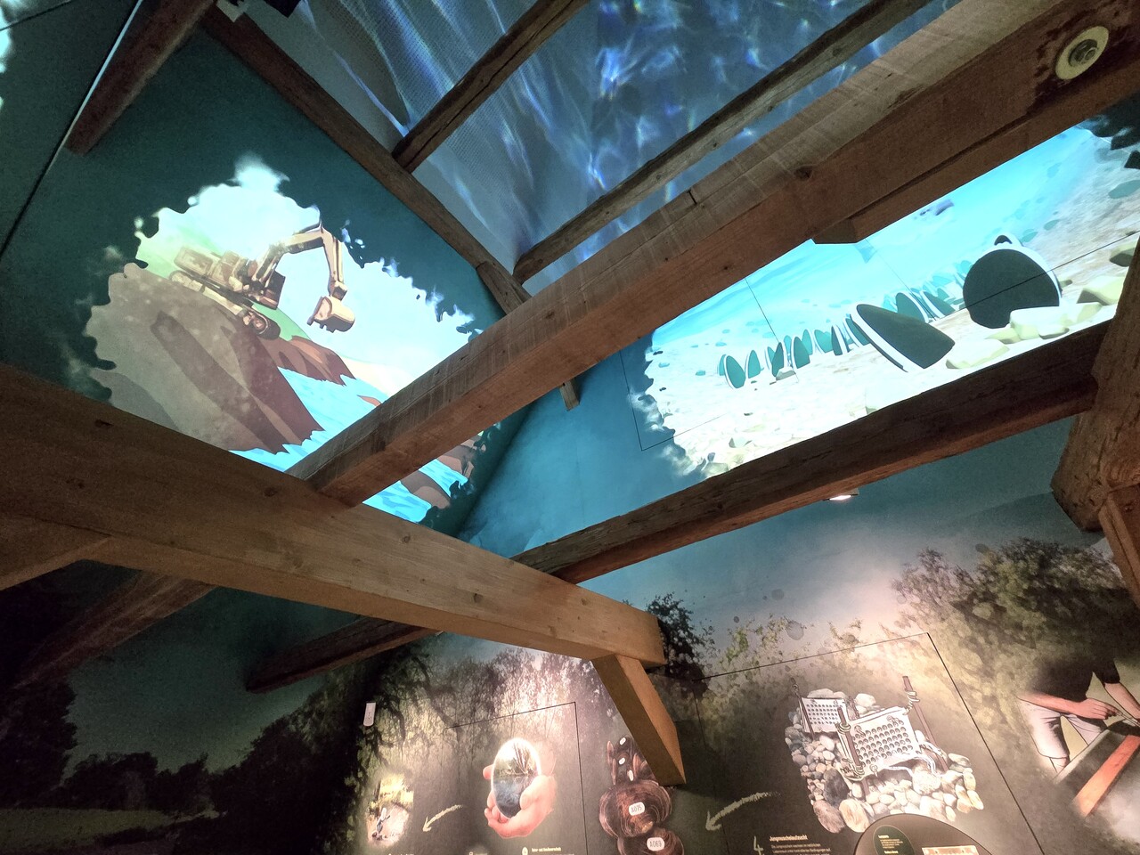 Eine immersive Projektion in den Giebel des historischen Ausstellungssraums behandelt den Lebenszyklus, die Gründe für das Verschwinden sowie die Wiederansiedlung der Flussperlmuschel.