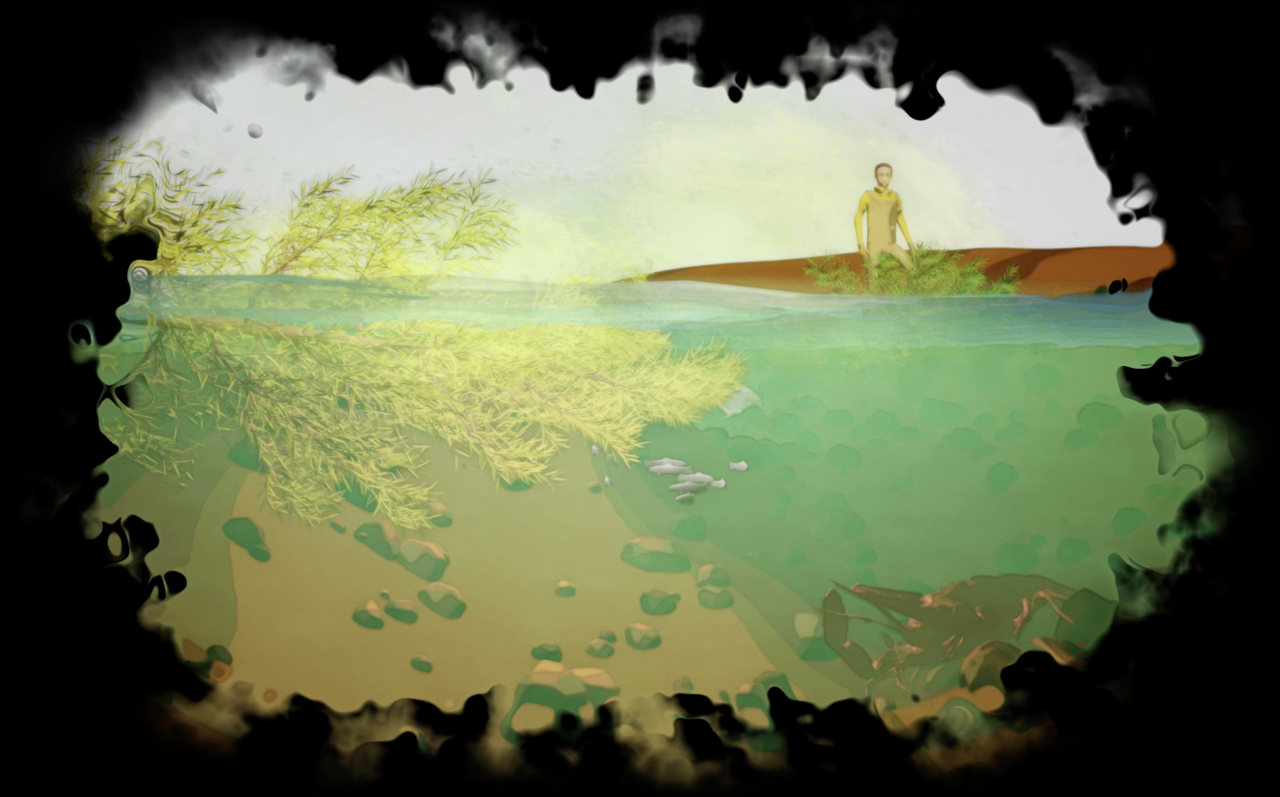 The content is embedded in a virtual riverbed and can be accessed by visitors through touch.