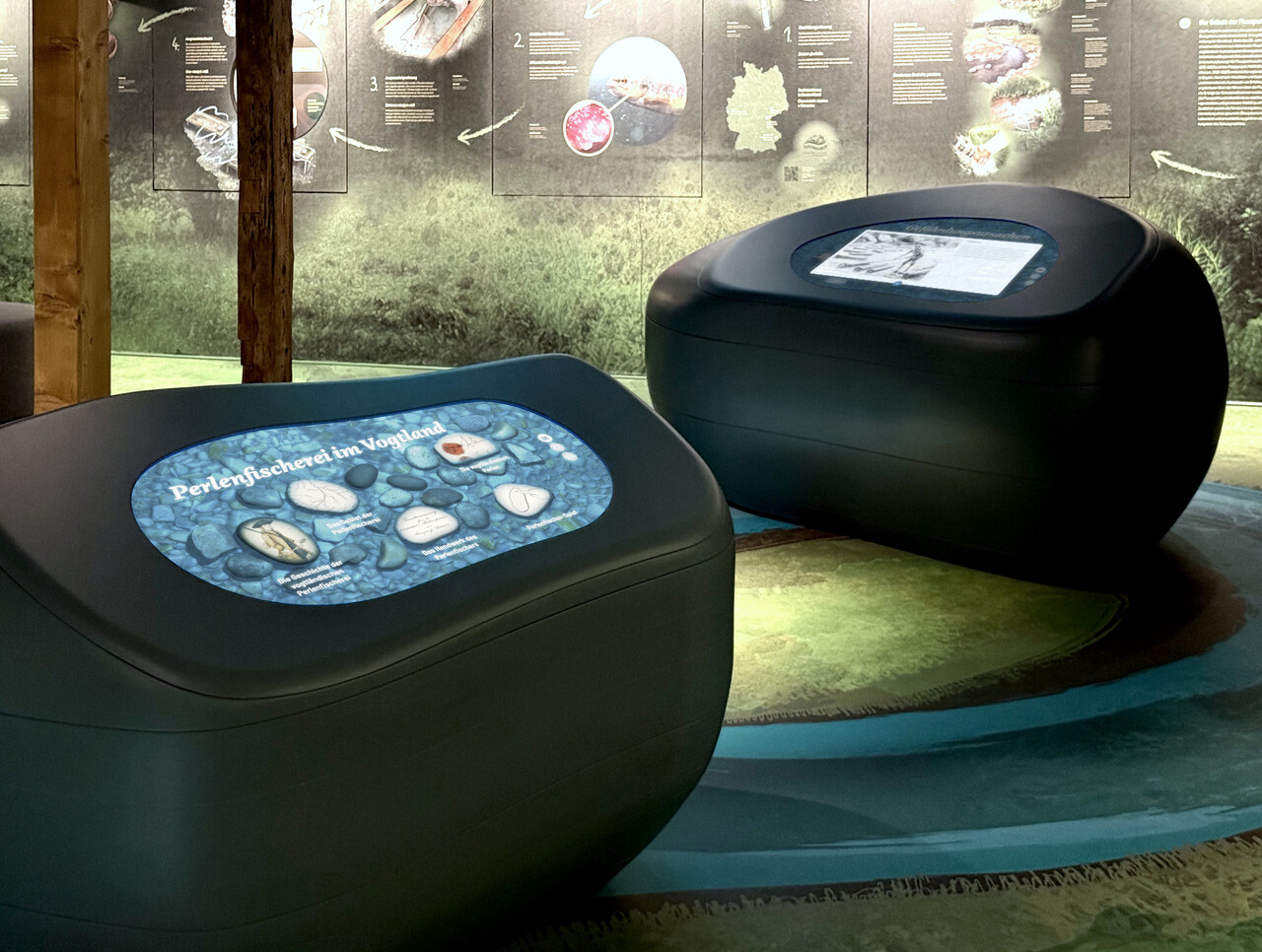 Two additional exploration stations, designed as stylized river stones, provide insight into the history of pearl fishing in the Vogtland region and inform visitors about the various causes of endangerment.