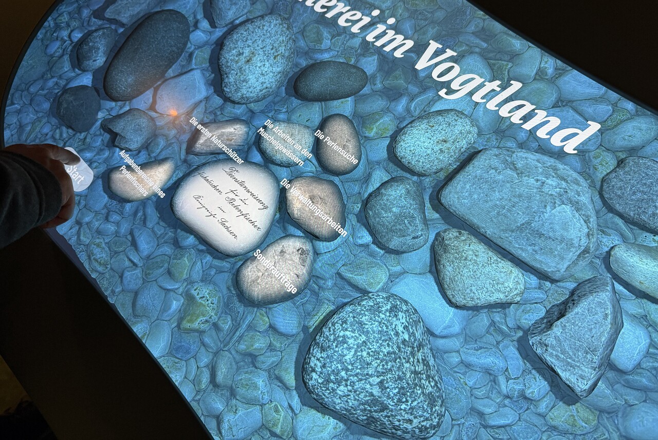 In the dormer windows of the historic building, visitors find digital exploration stations. Here, they can access detailed information about the anatomy and diet of the freshwater pearl mussel, as well as learn various facts about pearl formation and cultivation.